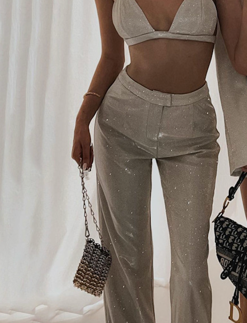 Shine with effortless elegance in our Glamour 3-Piece Sequin Set. Designed for the modern, confident woman, this stunning ensemble features a shimmering bralette, tailored high-waist trousers, and a chic oversized blazer.