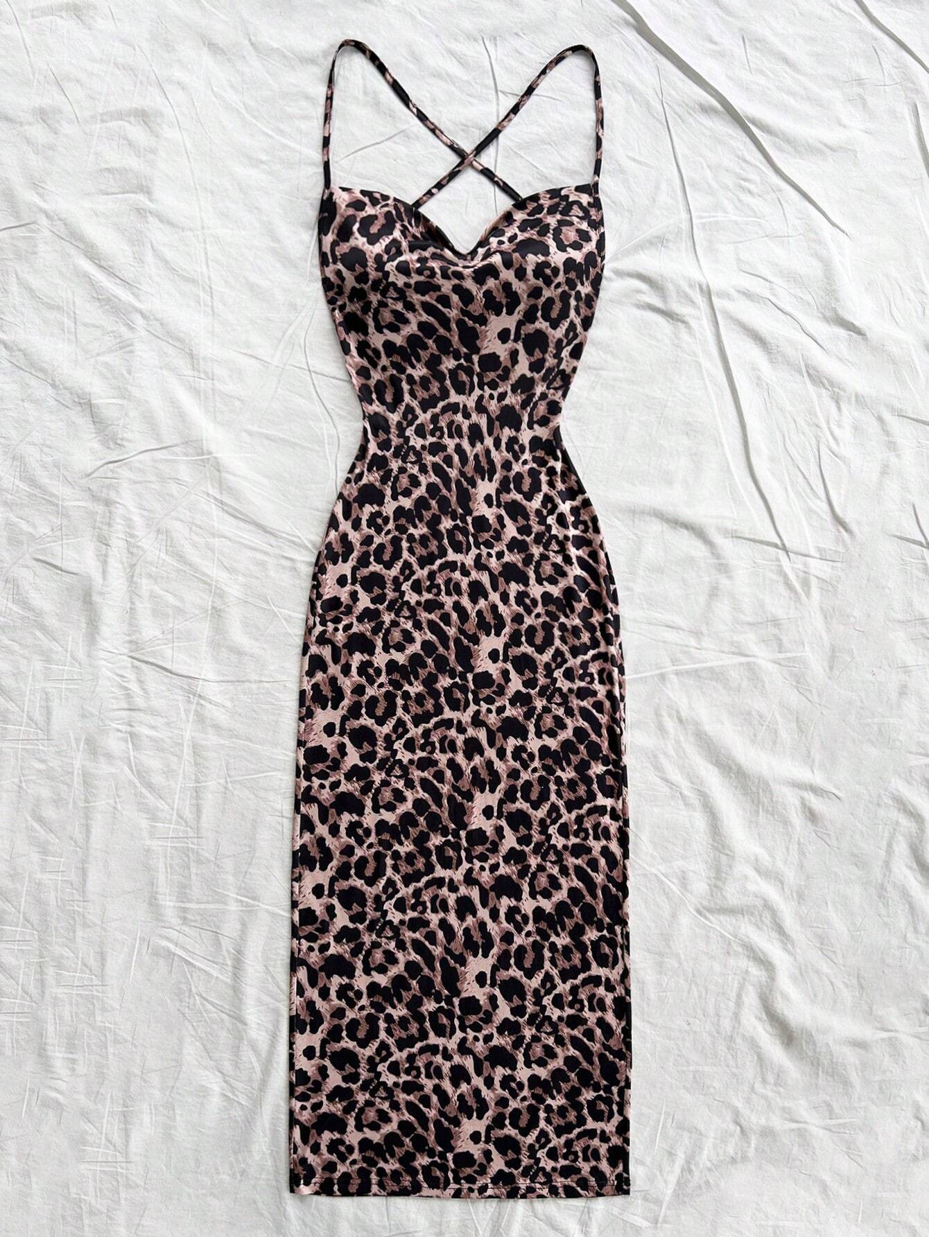Langes Leo-Print-Kleid mit Spaghettiträgern